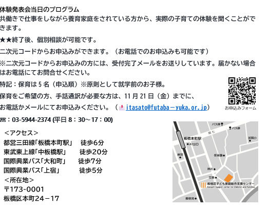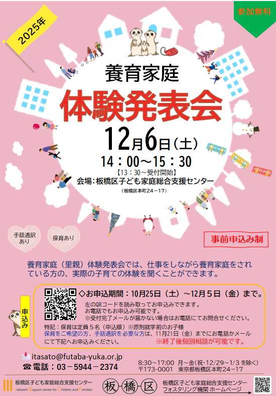 板橋区では、12月6日(土)に養育家庭体験発表会を開催いたします。